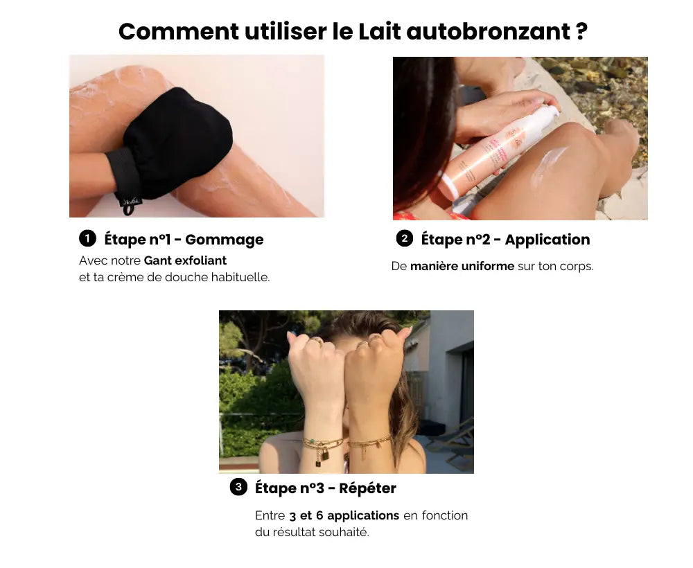 Le lait agit dès la première application et donne un bronzage de plus en plus intense après environ 3 jours. Une fois que tu obtiens la teinte souhaitée, applique le lait tous les deux jours pour maintenir la bronzage.