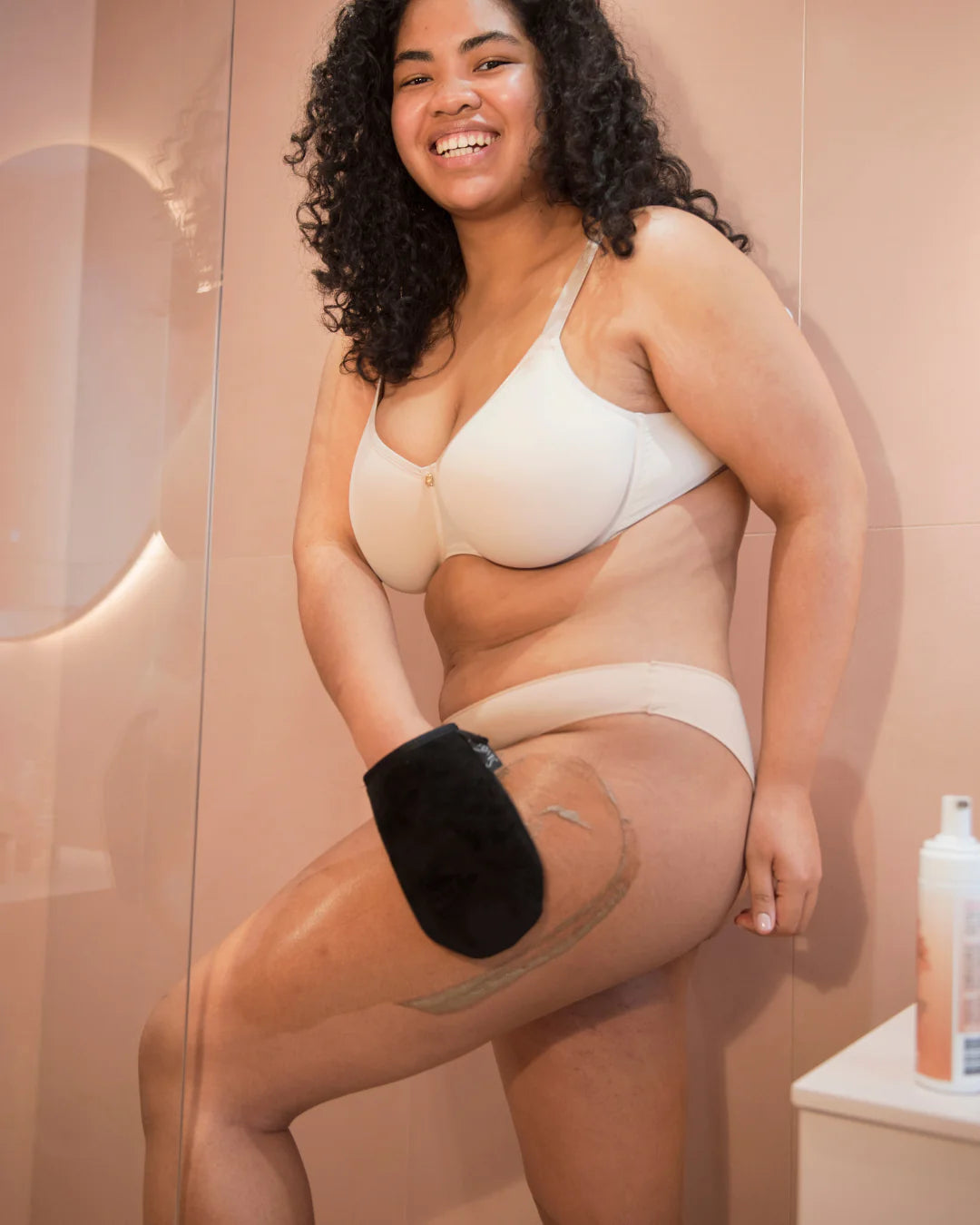 Marie, applique son soin autobronzant avec le gant